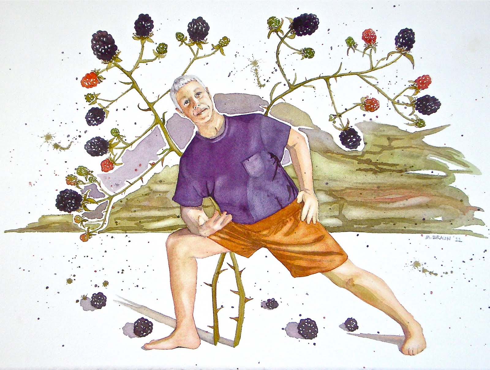 The background is abstract with shapes and colors that seemed to flow out of this strengthening pose as well as reflecting the blackberries, sweet but very prickly. It seems in this town we are surrounded by huge mounds of blackberries at this time of year. Also I was working towards a masculine energy in this painting... a feeling of strength and power, yet the gentleness of the model shines through.